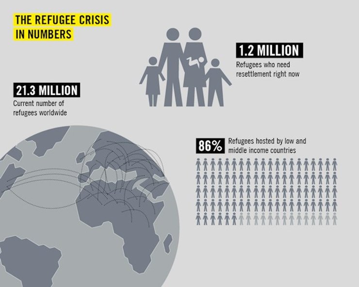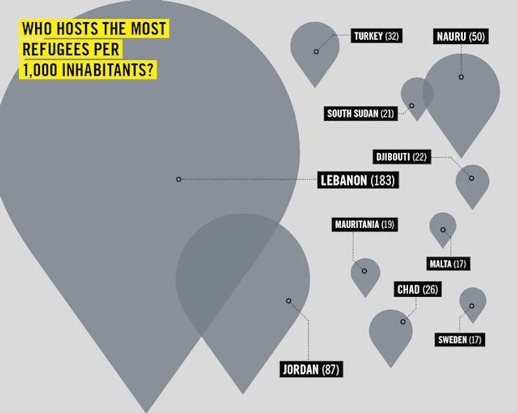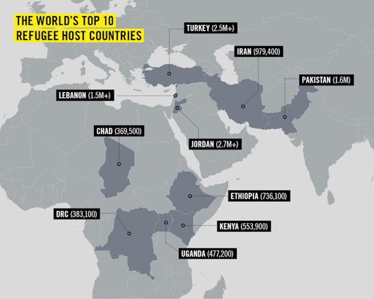 Так, наибольшее количество беженцев размещают у себя Иордания (2,7 млн человек), Турция (2,5 млн), Пакистан (1,6 млн), Ливан (1,5 млн), Иран (979 тыс.), Эфиопия (736 тыс.), Кения (554 тыс.), Уганда (477 тыс.), Демократическая Республика Конго (338 тыс.), Чад (369 тыс.).