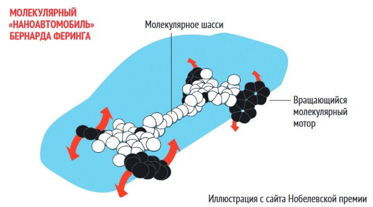 С тех пор в лабораториях были созданы самые разные молекулярные машины, которые по их функциональности можно было бы назвать "лифт", "искусственный мускул", "компьютерный чип" или "мотор". А в 2011 году группа Бернарда Феринга продемонстрировала, как работает 4-колесный наноавтомобиль (по внешнему виду он действительно схематически напоминает автомобиль).