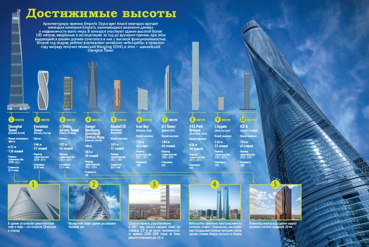 Архитектурную премию Emporis Skyscraper Award ежегодно вручает немецкая компания Emporis, занимающаяся анализом данных о недвижимости всего мира. В конкурсе участвуют здания высотой более 100 метров, введенные в эксплуатацию за год до вручения премии, при этом выдающийся дизайн должен сочетаться в них с высокой функциональностью. Второй год подряд рейтинг возглавляют китайские небоскребы: в прошлом году награду получил пекинский Wangjing SOHO, в этом — шанхайский Shanghai Tower.