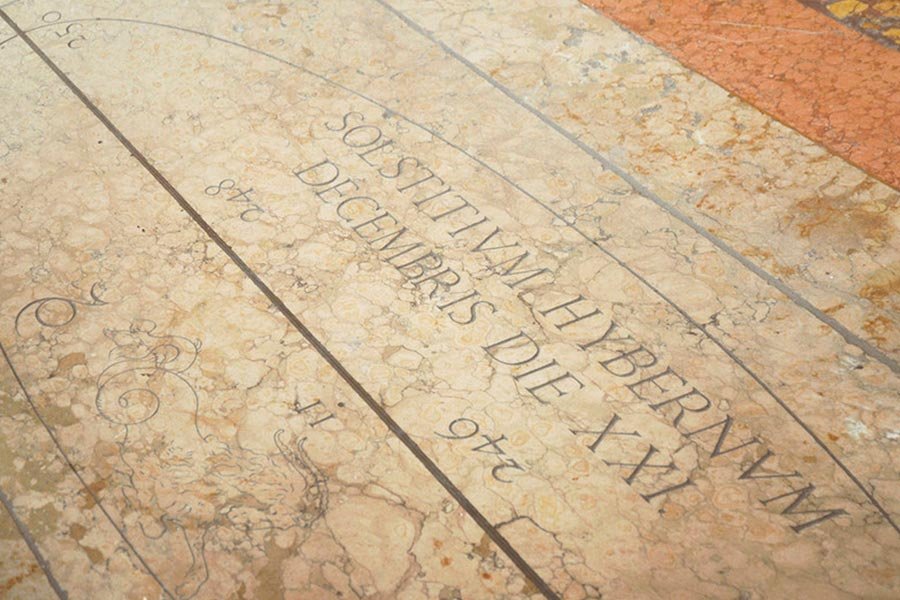 Пока снаружи солнце медленно движется по своей небесной траектории, здесь, в храме, проецируемый луч сантиметр за сантиметром ползет по мраморному полу. Ровно в полдень, когда светило окажется в зените, сгусток света доберется до длинной прямой линии инкрустированной латунью и медью. Ее длина — около 68 м, или две третьих длины поля для американского футбола. "Эта линия следует исключительно своей геометрической логике, и это несмотря на то, что она простирается более чем до половины собора", — рассказывает Джефф Маноух. Длинная косая линия, обрывающаяся между двумя колоннами, действительно выглядит странно, посмотрев на план здания, можно подумать, что кто-то попытался его перечеркнуть.