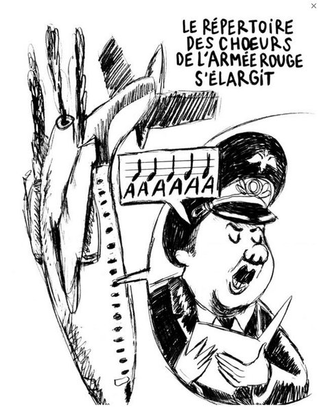 На третьей карикатуре изображены военные, которые поют под водой. На заднем плане виден разбившийся Ту-154. При этом мимо военных проплывают рыбы, которым нравится их пение. Надпись над карикатурой: "После катастрофы Красная Армия завоевала новую аудиторию".
