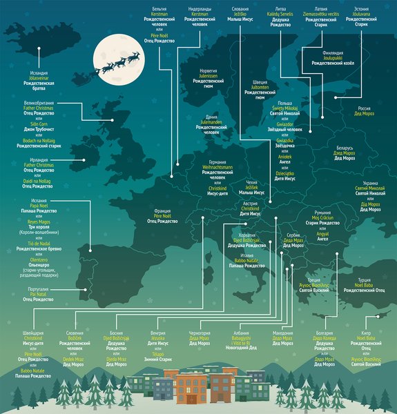 Якуб Мариан, 26-летний чешский лингвист и математик, регулярно публикующий на своем сайте различные данные о странах Европы, виузализированные в виде инфографики, на днях представил очередную карту — вымышленных рождественских персонажей, приносящих детям подарки. "Одни из них достаточно милы, как, например, британский Отец Рождество, другие весьма причудливы, как каталонское "испражняющееся бревно", но все они достаточно интересны", — уверяет автор. Примечательно, что то, кого именно ожидают в канун Рождества, зависит не только от территории, но и от языка. Франкофоны, в какой бы стране ни жили — и во Франции, и в Бельгии, и в Швейцарии — встречают Пэр Ноэля, французскую версию Отца Рождества, а говорящим по-немецки и в Германии, и в Швейцарии приносит подарки Дитя Иисус.