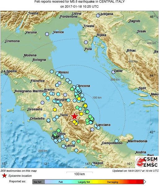 Утром 18 января в итальянских областях Лацио, Абруццо и Марке в течение часа произошли три сильных землетрясения магнитудой от 5,3 до 5,7. Об этом сообщает Русская служба ВВС со ссылкой на местные СМИ.