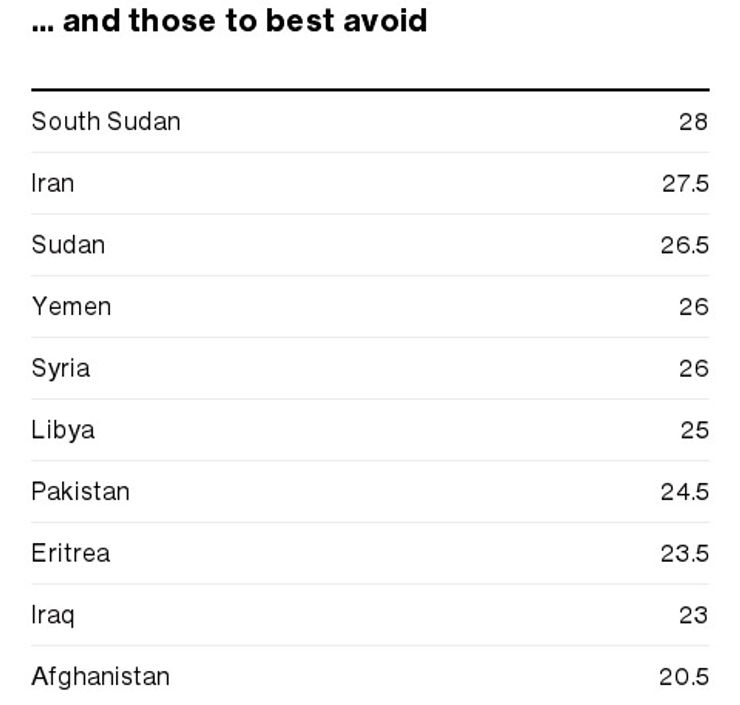 Также при оценке учитывалось, есть ли в стране обязательная воинская повинность, уровень слежки госструктур за гражданами, уровень преступности, свобода слова и прочие факторы.