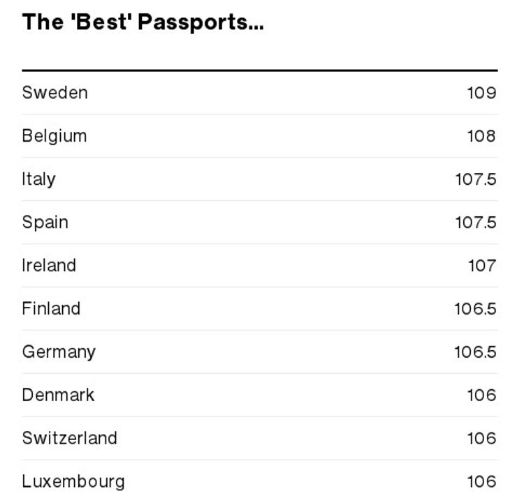 Возглавляет рейтинг Швеция, за которой следует несколько стран Евросоюза. Шведский паспорт открывает безвизовый путь в 176 стран.