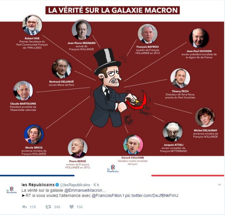 Партия кандидата в президенты Франции Франсуа Фийона "Республиканцы" опубликовала в Twitter антисемитскую карикатуру на независимого кандидата Эммануэля Макрона, но впоследствии извинилась за это. Об этом сообщает Европейская правда со ссылкой на Lexpress.fr.