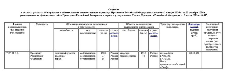 Декларация Путина не содержит детальной расшифровки и не указывает источники его дохода. В его собственности числятся земельный участок на 1,5 тыс. кв. м., квартира в 77 кв. м. и гараж (18 кв. м).