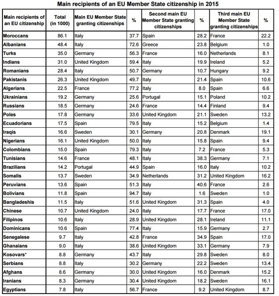 Основными получателями европейского гражданства в 2015 году были граждане Марокко (86 100 человек, из них 88% получили гражданство Италии, Испании или Франции).