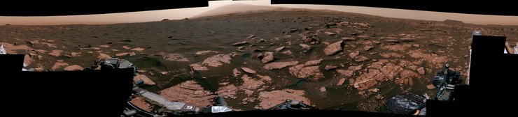 На переднем плане снимка можно увидеть некоторые части марсохода и коренные породы формации Мюррея, сформированные отложениями, которые образовались в озерах миллиарды лет назад. На северо-западном склоне горы Шарп располагается местность под названием "пляж Огунквит".