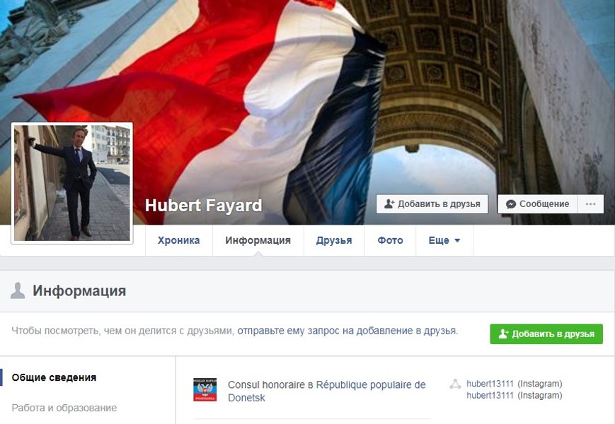 Французский политик регионального уровня Юбер Файяр из департамента Буш-дю-Рон объявил себя "почетным консулом" террористической организации "ДНР" во Франции. Соответствующая запись появилась на его странице в Facebook в разделе "Работа и образование", сообщает Европейская правда.