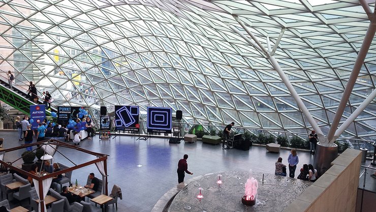Поражает футуристическим дизайном многофункциональный комплекс "Золотые террасы". При первом взгляде может показаться, что гигантская волна хлынула между небоскребами, но потом почему-то застыла. Его крыша выполнена из стекла, в ней нет ни одной прямой линии. Внутри комплекса стены и потолок также наклонены, отчего возникает ощущение, что попал в гигантский пузырь.