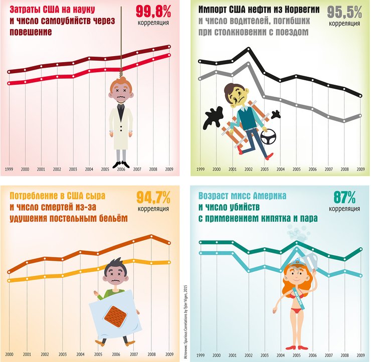 А аналитик big data Тилер Вигель в своей книге "Неправдивые корреляции" привел примеры явно бессмысленной интерпретации big data.