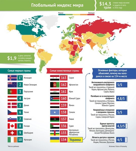 Боевые действия, низкий уровень общественной безопасности, большое количество оружия на руках у населения — и мы попали в десятку самых воинственных стран планеты по версии "Глобального индекса миролюбия". Его ежегодно составляет Институт экономики и мира в Сиднее. В этом году Украина согласно этому исследованию заняла по уровню миролюбия 154-е место из 163 возможных.