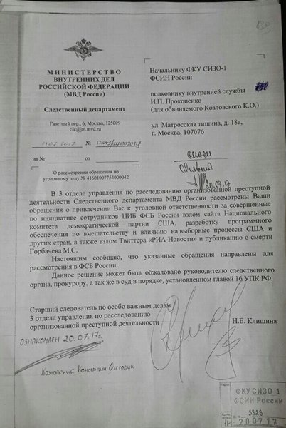 Козловский сообщил, что он "выполнял разные задания под руководством сотрудников ФСБ". Среди них были взлом серверов Национального комитета Демократической партии США, переписки кандидата в президенты США Хиллари Клинтон, а также атаки на другие "очень серьезные военные предприятия США и прочие организации".