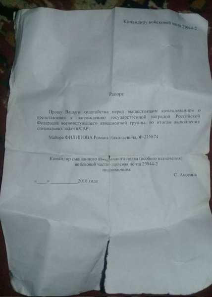 В кармане погибшего пилота найден документ на имя майора Романа Филлипова. Документ является представлением к государственной награде за выполнение боевых задач на территории Сирии. Об этом сообщает Conflict Intelligence Team. Рапорт составлен от имени командира "смешанного авиационного полка особого назначения" подполковника Аксенова, который командовал российской авиагруппой в Сирии.