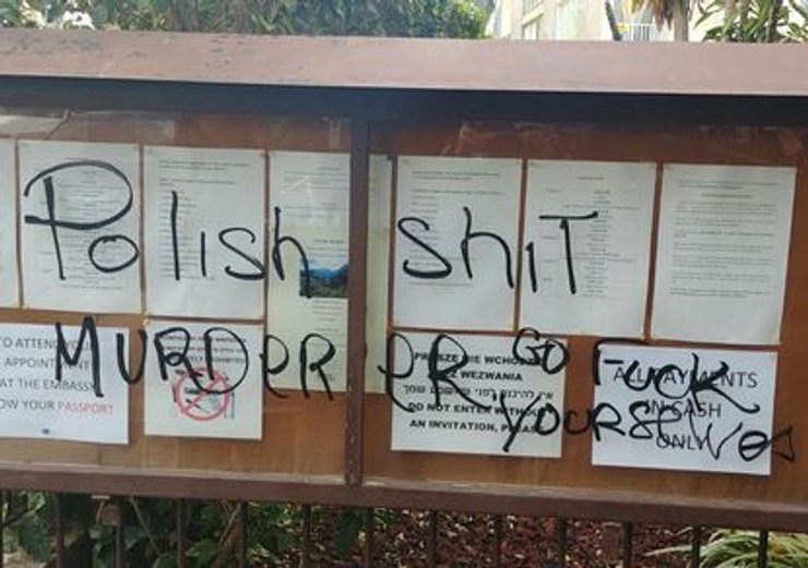 В Тель-Авиве неизвестные напали на посольство Польши в Израиле. Злоумышленники расписали доску объявлений и вход на территорию диппредставительства непристойными надписями и свастикой.