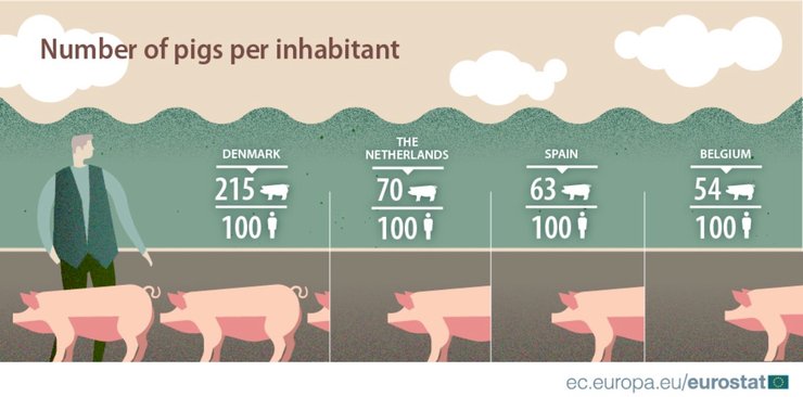 По данным Евростата, в Дании на 100 человек приходится 215 свиней (в 2016 году). Тем не менее, также высокие показатели в Нидерландах (70 свиней на 100 жителей), в Испании (63 на 100) и Бельгии (54 на 100).