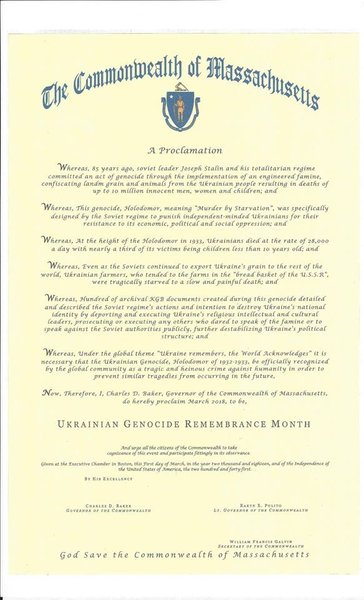 Штат Массачусетс (США) признал Голодомор в Украине 1932-1933 годов геноцидом против украинского народа. Соответствующую прокламацию выдал губернатор штата Чарльз Бейкер. Об этом сообщает украинское посольство в США в Facebook.