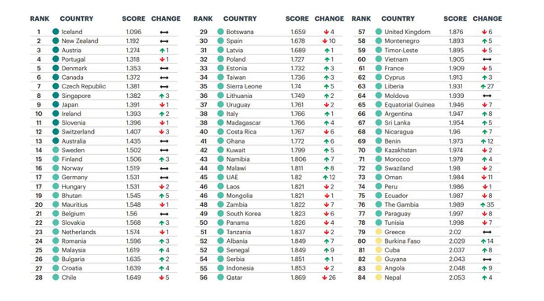 Исландия остается самой мирной страной в мире с 2008 года. Новая Зеландия, Австрия, Португалия и Дания также входят в пятерку самых мирных стран. Хотя Европа в целом остается наиболее стабильным и мирным регионом мира, показатели миролюбия в странах Европы также снизились.