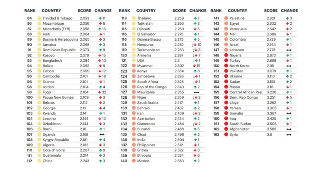 На последнем 163-м месте в рейтинге стран - Сирия. Ближний Восток и Северная Африка является наименее мирным регионом на планете, хотя в них и наблюдается тенденция к улучшению ситуации. Украина и Россия находятся на 152 и 154 местах соответственно.