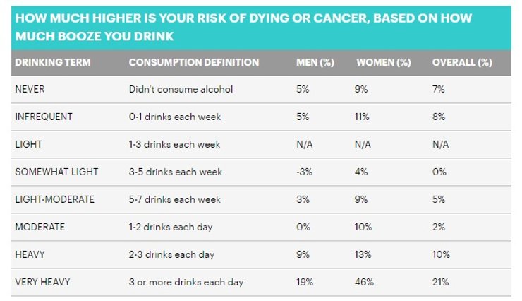 У сильно пьющих (три или более алкогольных напитков каждый день) оказался самый высокий риск ранней смерти, а риск развития рака составил 21%. За этой группой следуют люди, которые выпивали по два-три напитка каждый день – они на 10% чаще умирали молодыми или заболевали раком.