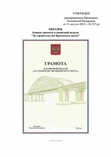 Президент РФ Владимир Путин учредил памятную медаль "За строительство Крымского моста". Ее будут вручать российским и зарубежным гражданам, а также организациям, внесшим значительный вклад в возведение этого объекта.
