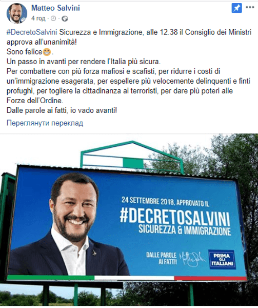 Вице-премьер, глава МВД Италии Маттео Сальвини заявил, что правительство страны одобрило ужесточение миграционной политики.