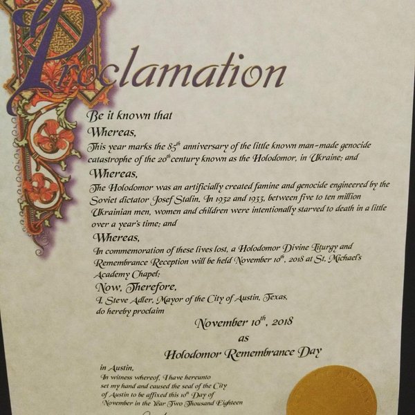 Мэрия города Остин издала прокламацию, которая установила 10 ноября 2018 года Днем памяти жертв Голодомора