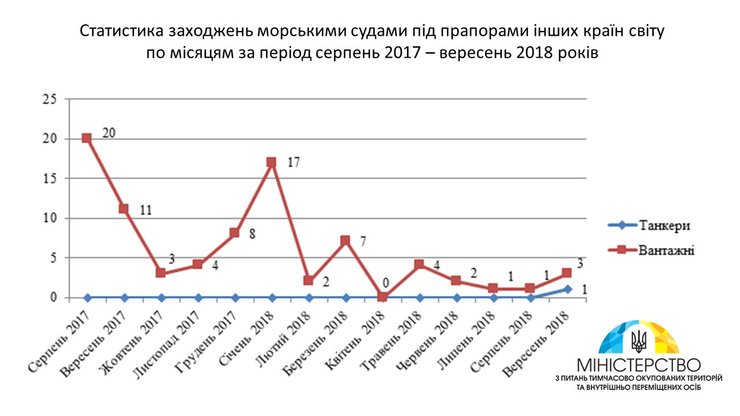 Всего с 1 августа 2017 года по 30 сентября 2018 года в портах и портовых акваториях оккупированного Крыма зафиксировано 1207 заходов грузовых судов и танкеров. При этом 1123 захода осуществили 98 судов под российским флагом.