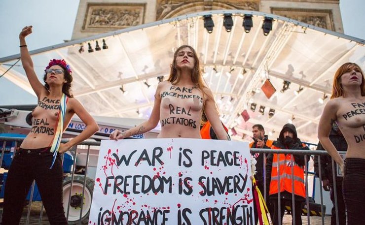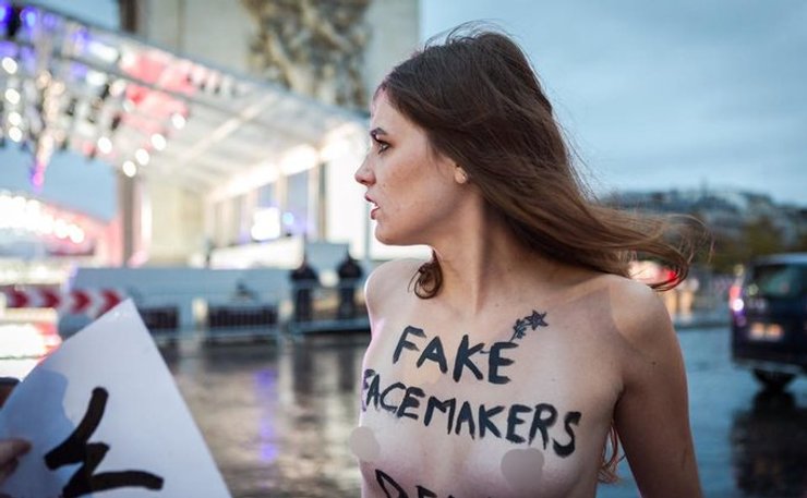 Сегодня, 10 ноября, представительницы движения Femen оголились у Триумфальной арки в Париже, где проходят мероприятия с участием главных лиц государства по случаю 100-летия окончания Первой мировой войны.