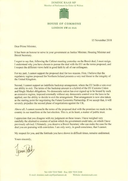 Британский министр по Brexit Доминик Рааб направил главе британского правительства Терезе Мэй прошение об отставке из-за Brexit.