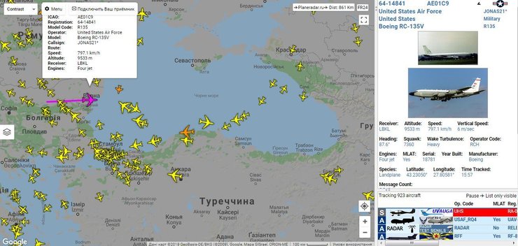 "В 7:50 по киевскому времени самолет радиоэлектронной разведки Военно-воздушных сил США Boeing RC-135V с позывным BASTE41 взлетел с авиабазы Суда бей на острове Крит в Греции и направился в акваторию Черного моря", - говорится в сообщении.