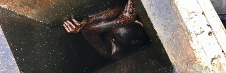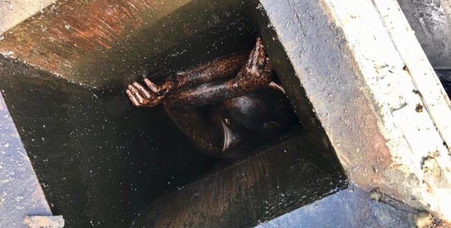 Спасателям понадобился час, чтобы извлечь покрытого жиром и грязью нарушителя. Потом его доставили в больницу, где у него диагностировали обезвоживание.