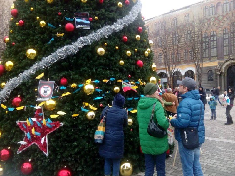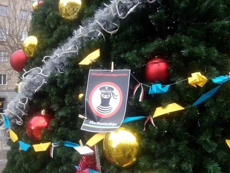 "Болгары и украинцы собрались сегодня в 15:00 возле собора Святого Воскресения, перед скандальной новогодней елкой, которую посол России Анатолий Макаров подарил жителям Софии несколько дней назад от имени правительства в Москве. Их акция - протест против агрессивной российской политики. Граждане требовали свободы для украинских моряков, арестованных в Керченском проливе. Недовольные политикой Кремля махали украинским флагом и плакатами с требованием остановить российскую агрессию", - отмечает издание.