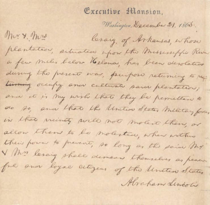 Двоюродный брат супруги Линкольна, Мэри Тодд, по фамилии Крейг был богатым рабовладельцем в Арканзасе. В письме Линкольн пишет о том, что семье Крейгов позволено вернуться на их плантацию. И они не должны подвергаться никакому насилию, если покажут себя как мирные и лояльные граждане Соединенных штатов.