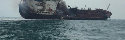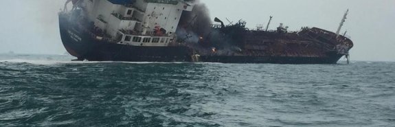 Танкер накренился на один борт, начался пожар. На фото и видео, которые появились в сети, видно, что корабль сильно поврежден.