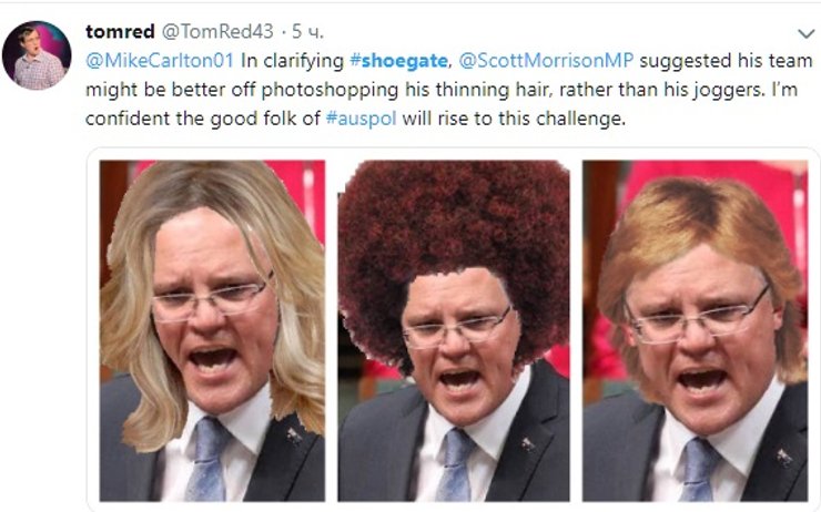 Сам Моррисон отреагировал с юмором. Он повесил фото тех самых злополучных кроссовок, которые так неудачно пытались скрыть, и попросил в следующий раз, если уже кому-то захочется использовать фотошоп, то пусть больше внимания уделят его волосам. "У меня их явная недостача", - пошутил политик. Также он сообщил, что это его любимые кроссовки, и он их обувает всякий раз, когда не требуется официальный дресскод.