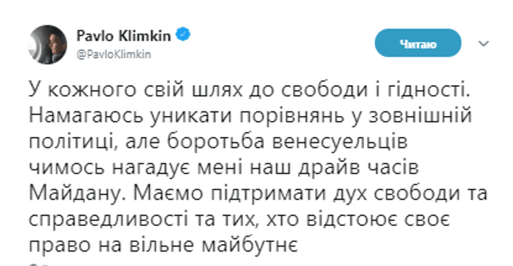"У каждого свой путь к свободе и достоинству. Стараюсь избегать сравнений во внешней политике, но борьба венесуэльцев чем-то напоминает мне наш драйв времен Майдана. Должны поддержать дух свободы и справедливости и тех, кто отстаивает свое право на свободное будущее", - написал министр.