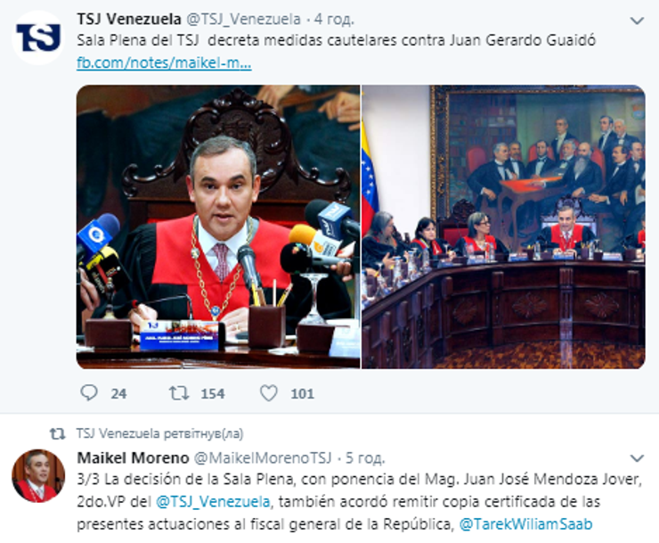 "Верховный суд в решении №1 от 29 января постановил следующие меры в отношении Хуана Херардо Гуайдо Маркеса: запрет на выезд из страны без разрешения до завершения расследования; запрет на продажу активов, находящихся в собственности, а также блокирование доступа и заморозка банковских счетов и/или любых других финансовых инструментов на территории Венесуэлы", - говорится в решении Верховного суда.