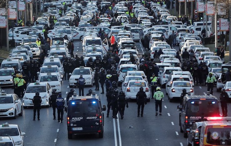 Таксисты в Мадриде блокируют транспортные магистрали города в рамках акций протеста против онлайн-сервисов частных автоперевозок, подобных Uber.