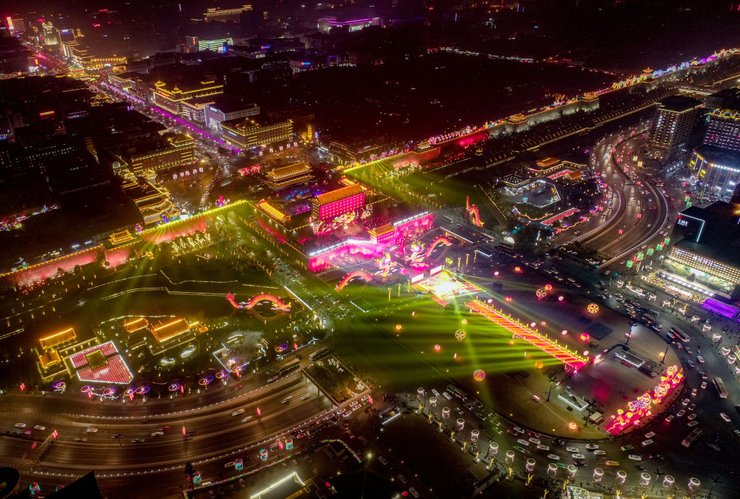 Вид сверху на освещенную городскую стену во время церемонии открытия фестиваля фонарей в Сиане, приуроченного к празднованию китайского Нового года.