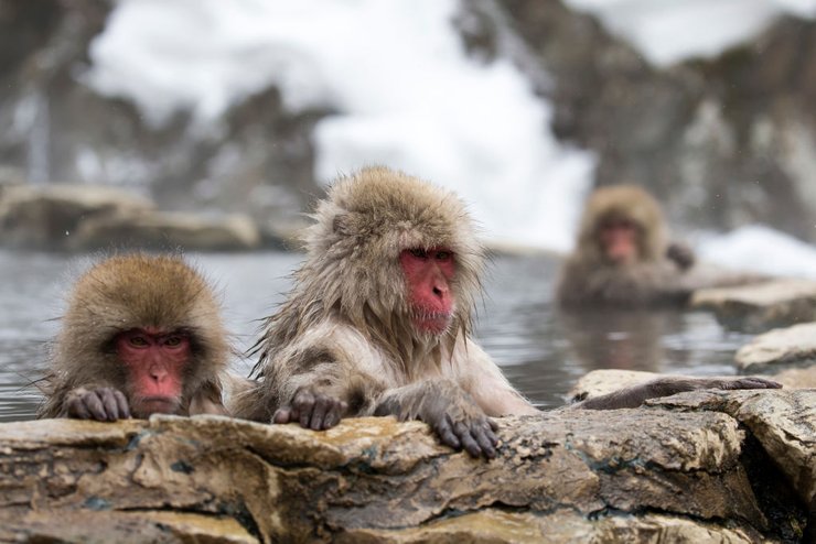Снежные макаки купаются в горячем источнике в парке обезьян Jigokudani Yaen-koen в Японии.