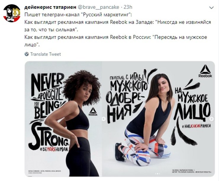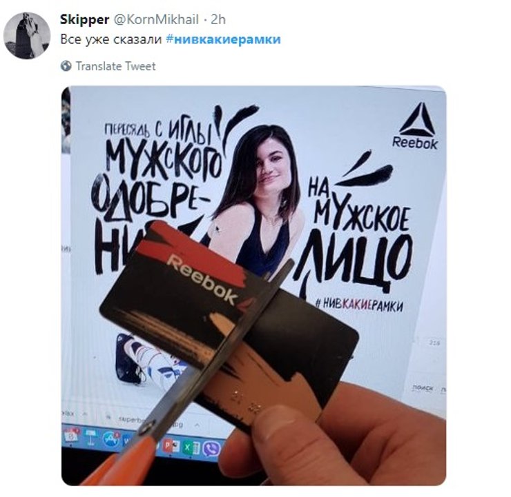 Оригинальный пост появился в Instagram-аккаунте Reebok Russia. После шквала критики часть фото оттуда удалили. Александр Голофаст, который занимался рекламной кампанией, рассказал, что удалить рекламу потребовало руководство. Хотя ранее все слоганы были одобрены. В итоге специалист по маркетингу сообщил, что больше не будет работать с брендом.