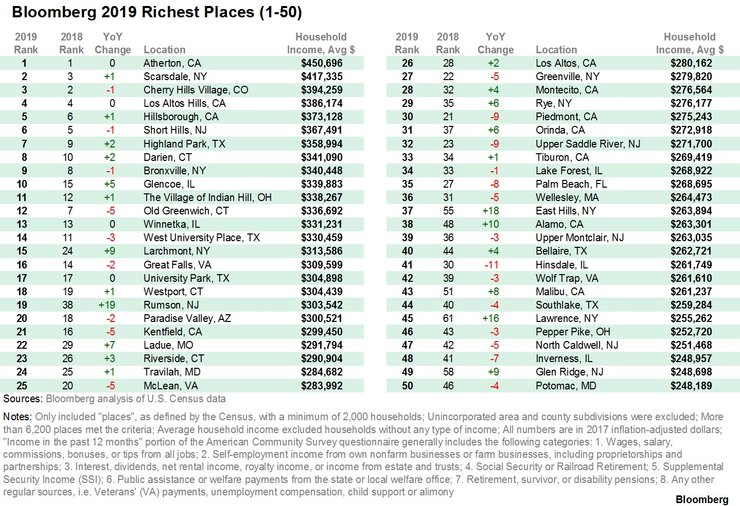 Первое место занял Атертон (Калифорния) со средним доходом домохозяйства 450,6 тысяч долларов. Город расположен недалеко от главного офиса Facebook.