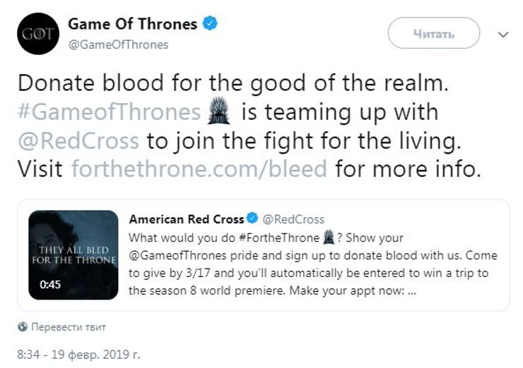 Фанаты сериала "Игра престолов" могут сдать кровь в донорских пунктах Международного комитета Красного Креста и получить шанс попасть на премьеру восьмого и заключительного сезона культовой киносаги.