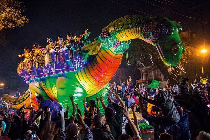 Старейший карнавал в США проводят в Новом Орлеане с XVIII века. Правда, колониальные власти, которые привезли идею из Европы, поначалу устраивали только костюмированные балы. Веком позже празднования выплеснулись на улицы, и традиции, начатые тогда, сохраняют в городе и поныне. Участники карнавала — это особые клубы, которые готовятся к мероприятию за год. Каждый клуб формулирует тему парада, тщательно хранит тайну до самого выступления. Парады в Новом Орлеане невероятно красочные. Некоторые клубы выступают, как в старину: на каретах, запряженных лошадьми, и с факелами. Традиционно используют особенные цвета карнавала — пурпурный, зеленый и золотой, — символизирующие справедливость, веру и силу. Карнавальные мероприятия начинаются в Новом Орлеане с середины января, но наибольшее число участников и зрителей привлекают в финальную неделю. В Жирный вторник, последний день перед постом и официальный выходной в Луизиане, клубы — участники парада выступают целый день. Каждый из них готовит сувениры для зрителей: монеты, медальоны, мягкие игрушки. Их разбрасывают вокруг. Считается большой удачей поймать такой сувенир.