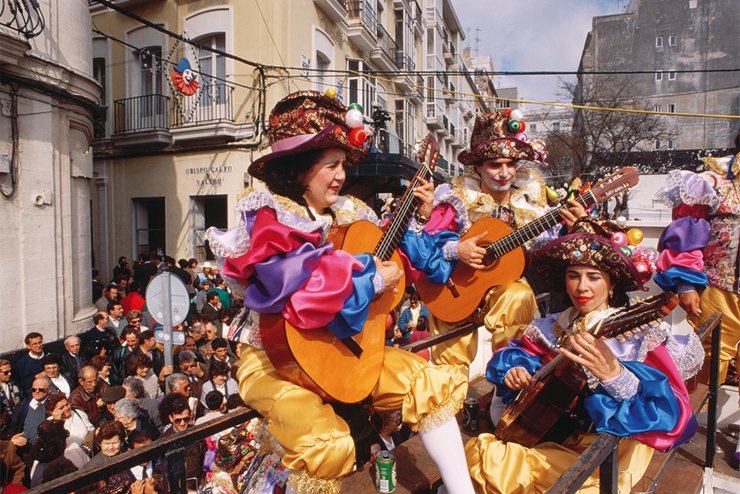 Жители Кадиса позаимствовали идею карнавала в Венеции, с которой у города-порта в XVI веке были отличные торговые связи. Однако в отличие от венецианского, где бал правят маски, кадисский праздник посвящен преимущественно песням — это главное развлечение и состязание во время карнавала. В конкурсе ежегодно участвуют до сотни коллективов — от больших хоров по 45 человек до квартетов, которые поют на ритмы пасодобля, танго, а также исполняют куплеты. Последние особенно привлекают горожан, поскольку главное их качество — едкая сатира на политические и общественные события, произошедшие в стране за год. Помимо песенного конкурса в Кадисе в первый день карнавала проходит большой парад, а в последний — комический парад. К ним участники готовятся за год, придумывая необычные номера и костюмы. Финал праздника — "похороны сардины", когда макет рыбы из папье-маше проносят по улицам с комической похоронной процессией и торжественно сжигают. Кадисский карнавал открыт для всех желающих. Более того, туристов активно приглашают присоединяться к парадам. Единственное условие: вы должны быть одеты в самый экстравагантный наряд, какой только придет вам в голову.