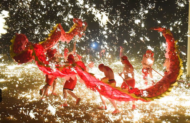 Артисты исполняют танец дракона в сопровождение фейерверков во время Праздника фонарей в Аньшуне (провинция Гуйчжоу, Китай).