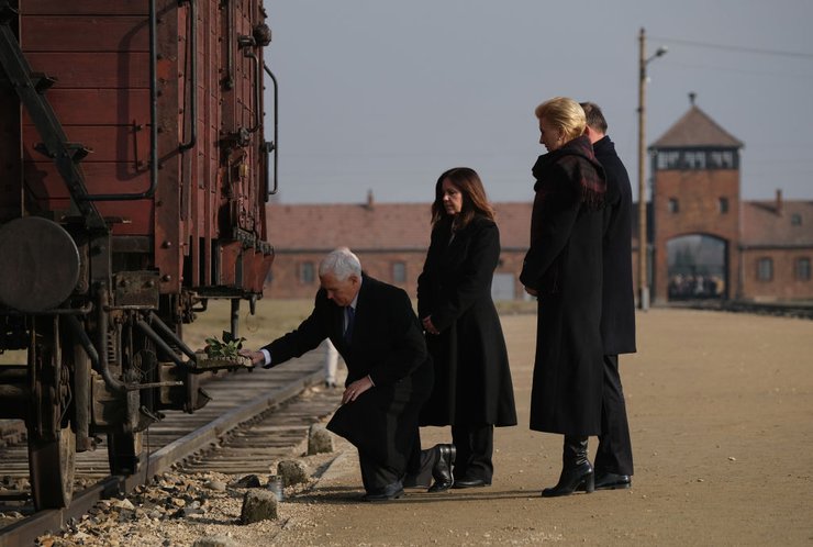 Вице-президент США Майк Пенс, вторая леди Карен Пенс, президент Польши Анджей Дуда и первая леди Польши Агата Корнхаузер-Дуда возлагают цветы к железной дороге, которая использовалась для перевозки заключенных в концентрационный лагерь Освенцим.