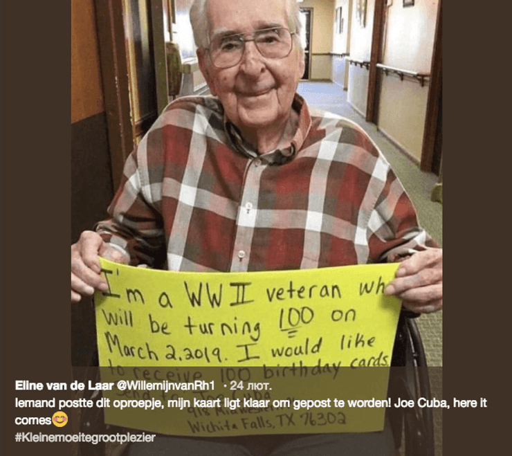 Американец Джо Куба попросил пользователей интернета отправить ему 100 открыток к его 100-летнему юбилею. Просьба ветерана Второй мировой войны растрогала жителей всего мира, и он получил тысячи поздравительных открыток.